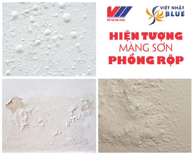 Là hiện tượng xuất hiện sau một thời gian hoàn thiện sơn, trên bề mặt tường có những vết phồng rộp cục bộ làm giảm độ bám dính, kèm theo là hiện tượng bong tróc, rạn nứt màng sơn nếu không xử lý kịp thời. Điều này vô cùng mất thẩm mỹ và khiến cho chất lượng công trình bị giảm sút.