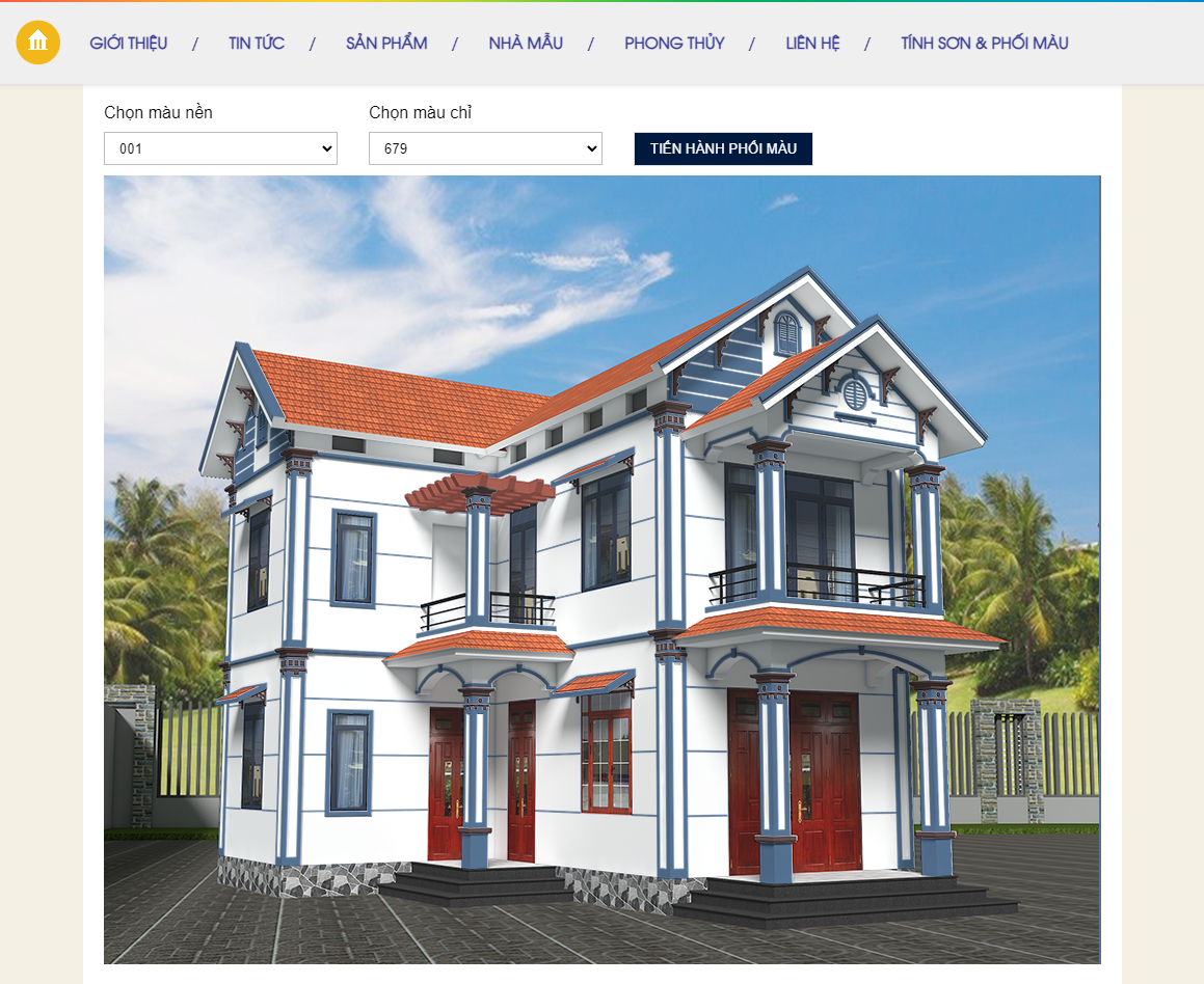 Tại đây, khách hàng chọn dáng nhà tương tự hoặc gần giống với nhà mình để tiến hành đổ màu. Phía trên ngôi nhà bạn chọn sẽ có 2 phần "Chọn màu nền" và "Chọn màu chỉ" bạn ấn vào để chọn màu mình đổ và bấm "TIẾN HÀNH PHỐI MÀU" để xem kết quả.